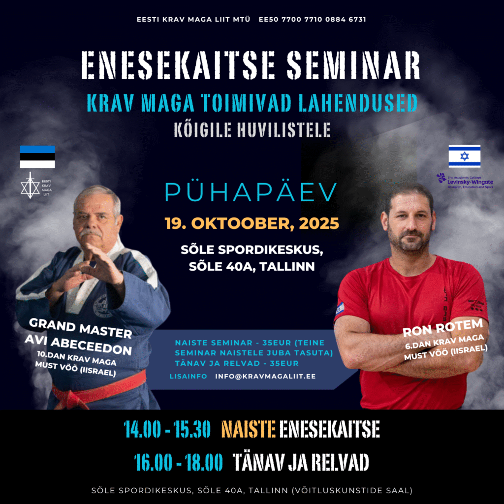 13.10.2025Tule ja veeda juba 19. oktoobril Tallinnas üks vinge pühapäev uute enesekaitseoskuste õppimise saatel, omandades teadmisi ning praktiseerides Iisraeli ja Eesti Krav Maga instruktorite käe all. Eestisse tulevad ülikogenud Krav Maga taktikalise enesekaitse instruktorid GM Avi Abeceedon ja Ron Rotem otse Iisraelist ning see on ainulaadne ning suurepärane võimalus oma ellu uut hingamist ning enesekindlust […]